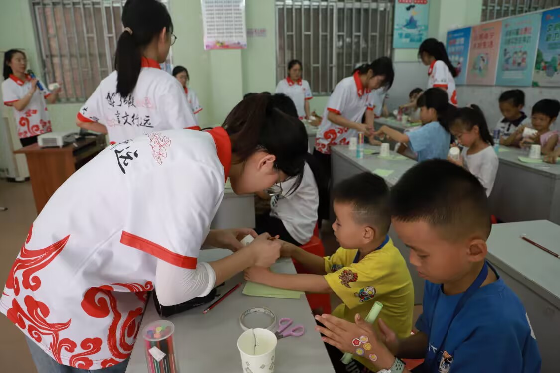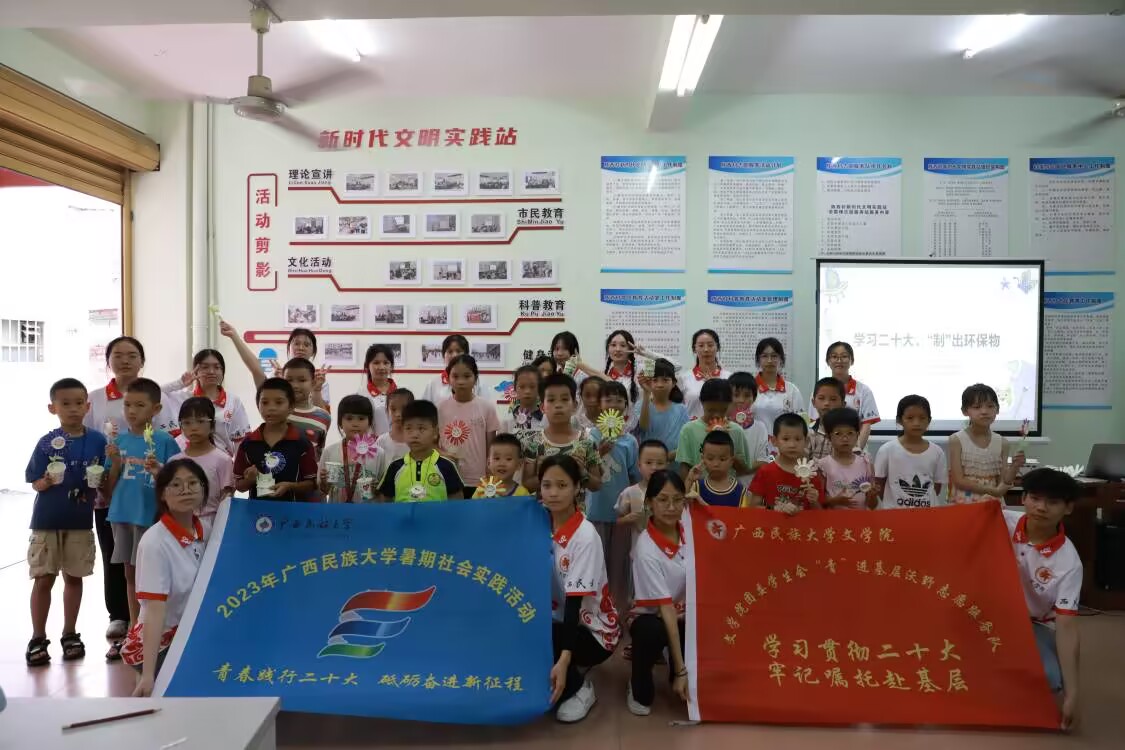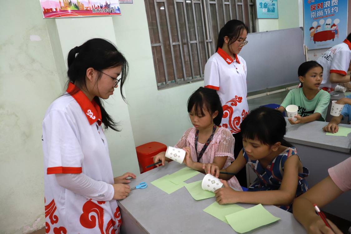 7月17日,文學院團委學生會“‘青’進基層沃野”志愿服務隊前往陳西村開展“學習二十大,‘制’出環保物”手工課堂活動,志愿者廖麗媛擔任主講人。