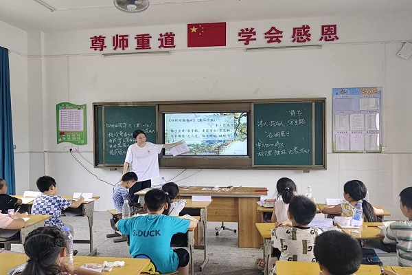 為了弘揚中國傳統文化,讓學生們接觸到更好的文化教育,優化古詩教學模式。武昌理工學院第十七屆“大手牽小手”崇陽啟明星志愿服務隊于2023年7月19日在崇陽縣洞泉村洞泉小學開展了古詩詞講解特色文化課程。