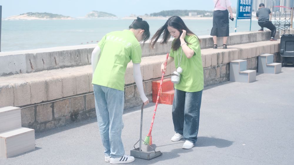 圖為實踐隊員在南門灣堤壩上清理垃圾