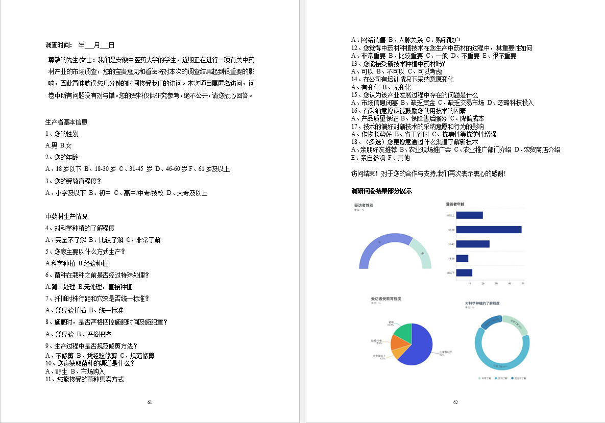 圖為團(tuán)隊(duì)成員于市場(chǎng)內(nèi)向廣大中藥愛好者發(fā)放的調(diào)查問卷及其部分結(jié)果分析,以便深入了解茯苓乃至十大皖藥產(chǎn)業(yè)的市場(chǎng)反響。