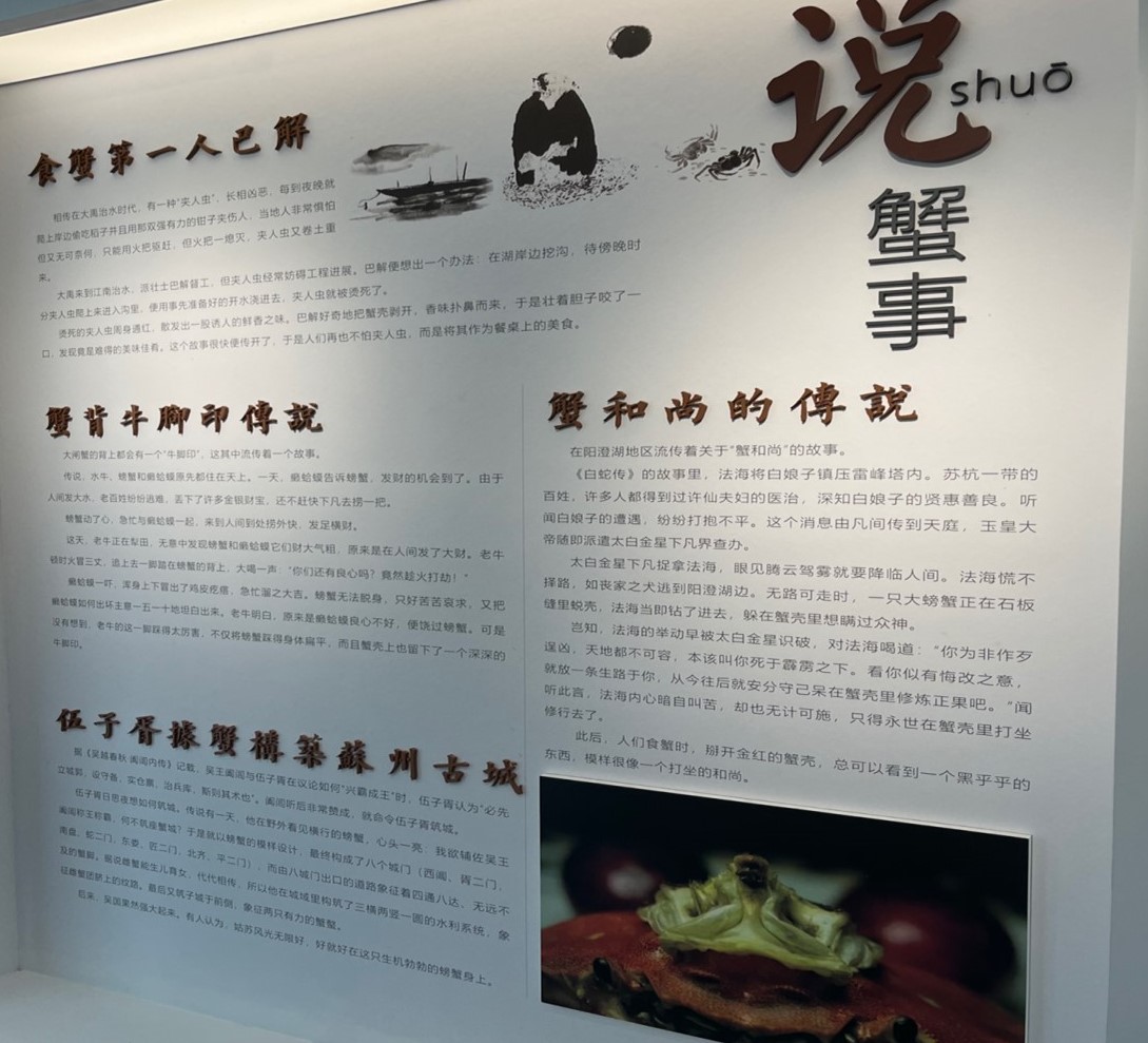 接著,文化館人員向實踐團成員們普及大閘蟹的歷史。其實大閘蟹被發現的時間遠比陽澄湖還早,可以追溯到大禹治水時代,那個時候蟹還被稱為“夾人蟲”,人們對它是避而遠之。直到巴解的出現蟹才作為美食登上餐桌,蟹也因此得名。實踐團成員終于解開了“是先有蟹還是先有陽澄湖”的謎底。關于陽澄湖養蟹的歷史可以追溯到二十世紀六十年代以前,那個時候還是散戶養殖,慢慢的從政府組織“大養蟹”到“養大蟹”再到現在的“精養蟹”,蟹產業逐步轉型升級,2020年蘇州市“陽澄湖大閘蟹”被授予中華人民共和國農產品地理標志登記證書,陽澄湖大閘蟹升級為“國字號”農產品。從此陽澄湖大閘蟹徹底在歷史的長河中站穩腳跟,一個屬于陽澄湖的黃金“蟹時代”漸漸到來。