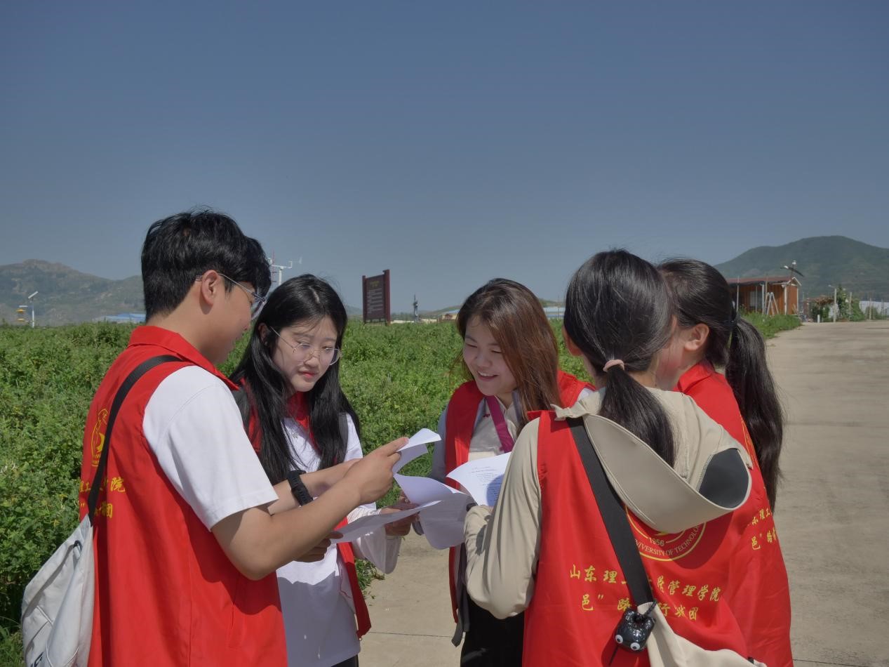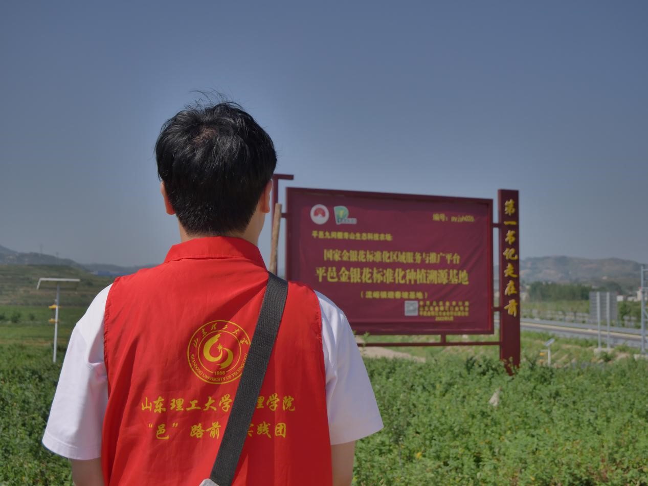 在基地工作人員的帶領下,以實地考察、走訪參觀、問卷調研等實踐形式,調研金銀花標準化種植基地,了解基地發展情況,探究金銀花產業鏈在平邑縣鄉村振興中發揮的重要作用以及學習九間棚共產黨人艱苦奮斗,不怕困難的精神。在實踐過程中,團隊成員充分發揮專業知識優勢,與基地工作人員深入交流學習,詳細了解了金銀花的種植管理、生產加工、產品銷售以及金銀花產業發展的整體情況。