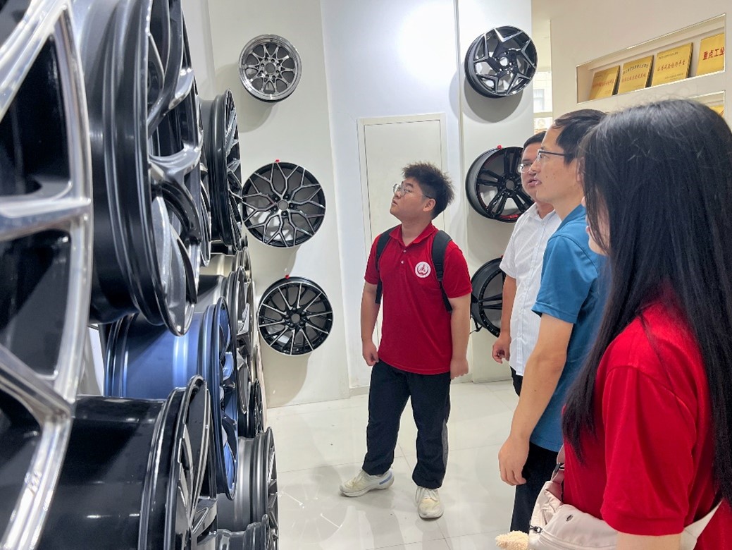 圖為座談交流現場隨后,實踐隊走出會議室,在公司工作人員的帶領下參觀公司展廳,查看了公司生產的不同型號的車輪輪轂、公司高端定制化產品以及代表當今尖端技術的碳纖維輪轂。