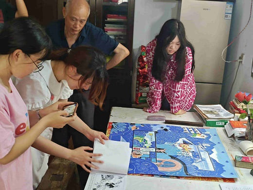 上世紀七十年代,鄭根良看見天上飛過的飛機尾跡,便立即用畫筆畫下來,小小的農民畫的種子正是萌芽于這些微小的對生活的記錄。為了得到點評,鄭根良還把畫拿去給專業的老師們看,老師們沒想到農民也有如此濃厚的創作熱情,便提議建立衢縣業余美術學習班,鄭根良成為了其中的首批學員之一。在十分簡陋的作畫條件下,鄭根良和許多農民畫家一樣,將門板當畫板,臥室當畫室,一邊從事農業生產勞動,一邊從事農民畫創作,在有限的條件中釋放著自己無限的創作熱情。