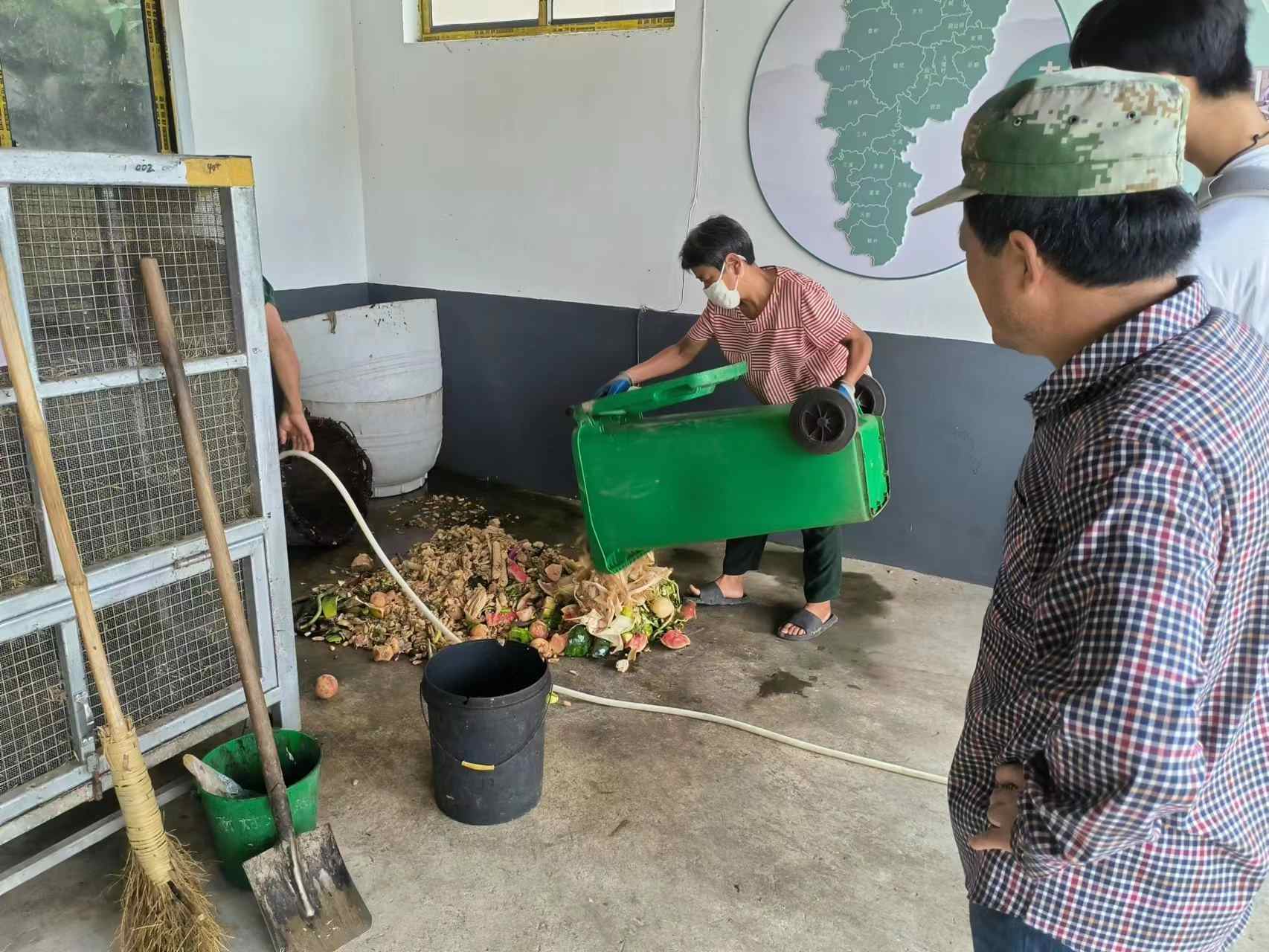 垃圾堆肥除了將餐前垃圾做成酵素,村民們每天產生的餐后垃圾也會被統一運到有機肥制造基地進行統一處理,箭嶺村獨創的“一層垃圾、一層酵素、一層黃土”的特殊配比不僅減少了垃圾的總量,也讓該有機肥的肥力大增。幾年來,箭嶺村對于垃圾堆肥積累了豐富的實踐經驗,村里的堆肥也已成一定規模,并成功入選了“中國社區廚余堆肥試點項目”。在劉安芬老師以及徐春定老師的陪同下,團隊成員走進堆肥場地進行了實地參觀。“每天下午3 點,我們的志愿者和環衛工人會把全村收集上來的廚余集中運到堆肥場地,大顆粒廚余略微破碎,與調節物質按比例拌勻,倒入堆肥箱,噴灑少量酵素,然后在上面鋪一層薄薄的落葉或秸稈,靜置發酵,大約40天后再移至腐熟箱等待腐熟。”負責堆肥的徐春定老師如是說。在全村的共同努力下,目前箭嶺村已實現全部廚余垃圾就地資源化處理。