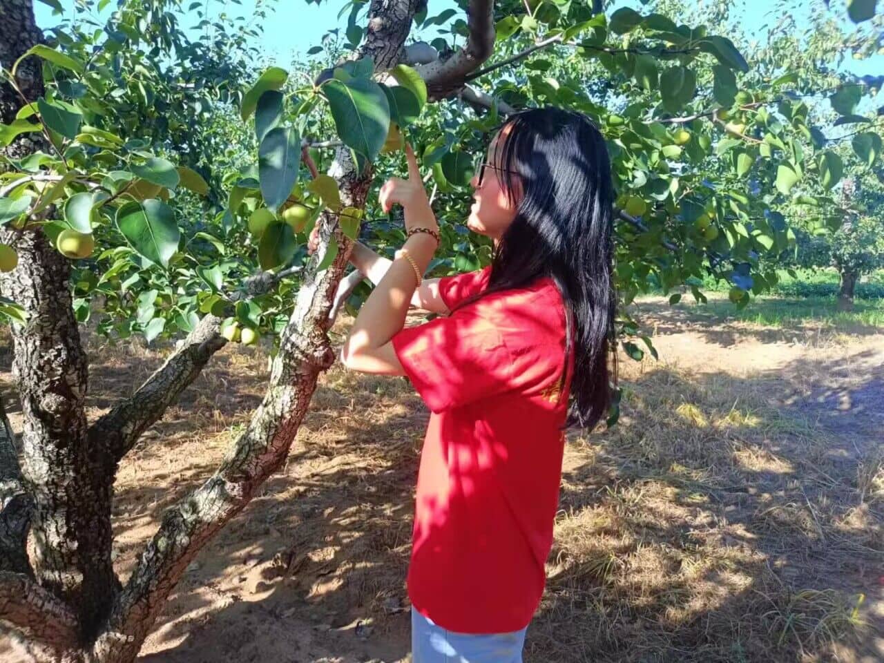 實(shí)踐隊(duì)員第一站來(lái)到了梨香四溢的酒店鎮(zhèn)梨子種植園。這片梨園位于鄉(xiāng)村深處,占地?cái)?shù)百畝,擁有多個(gè)品種的梨樹。碩大飽滿的梨子掛滿枝頭,蒼勁的梨樹,枝繁葉茂。據(jù)悉,每年的春季,當(dāng)梨花綻放時(shí),整個(gè)梨園都被一片潔白的海洋所包圍,景色宛如畫卷,美不勝收。