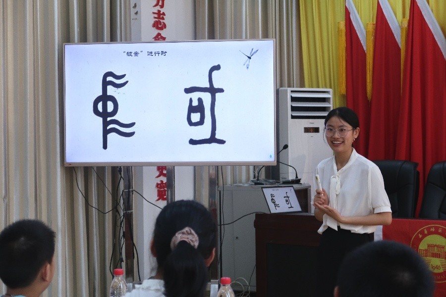 圖為我在講述“中國”二字的甲骨文字形。西華師范大學 唐馨琪 供圖