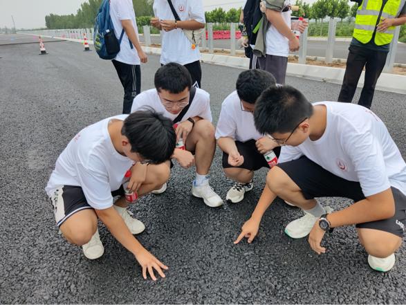 在學中干,在干中學,在項目推進中搞科研,在不斷探究中解難題。實踐隊重點了解其公司就項目施工問題所進行的的實驗革新,參觀新型模塊化混凝土路面,并與傳統瀝青路面進行對比,可有效防止車轍產生,實時監測道路運營狀況,便于后期維護。此外,在孫總工的帶領下,實踐隊還參觀了瀝青攤鋪現場和橋梁建設現場,現場感知路面的多層結構和瀝青鋪設,實際了解橋梁建設過程中可能出現的問題和相應的解決方案。
