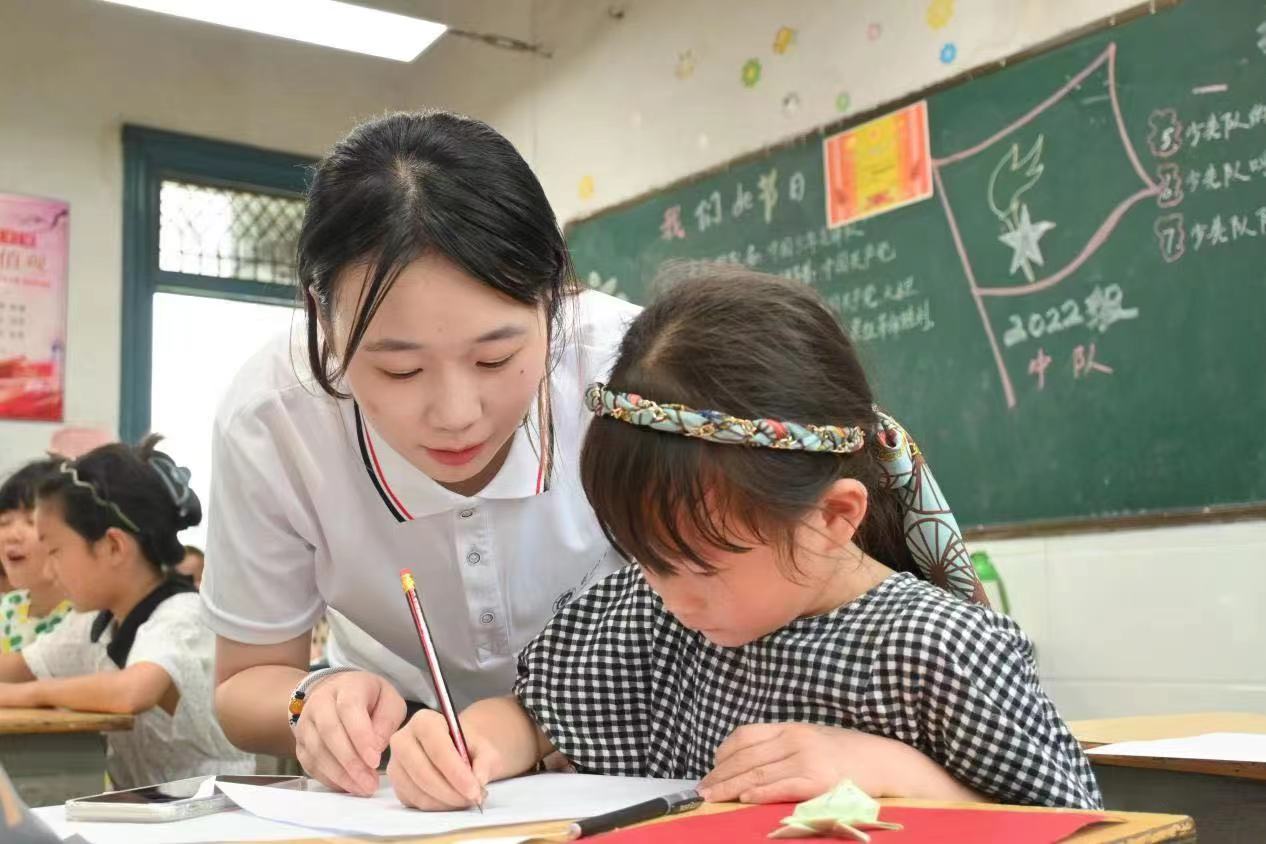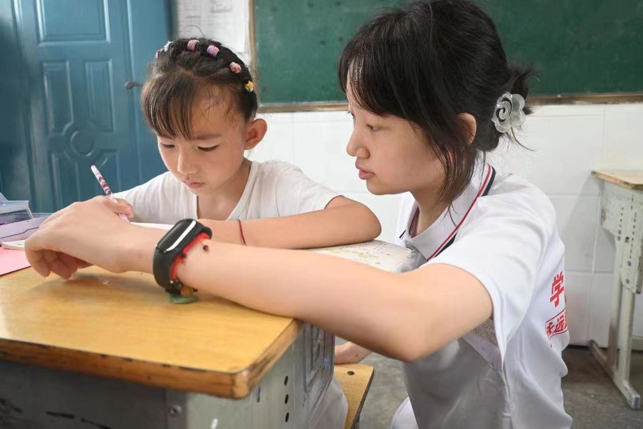 (圖為志愿者上國學文化課時讓學生們默寫詩句,志愿者一刻不放松的緊盯著學生們,看著他們一筆一劃寫下自己的學習成果。)