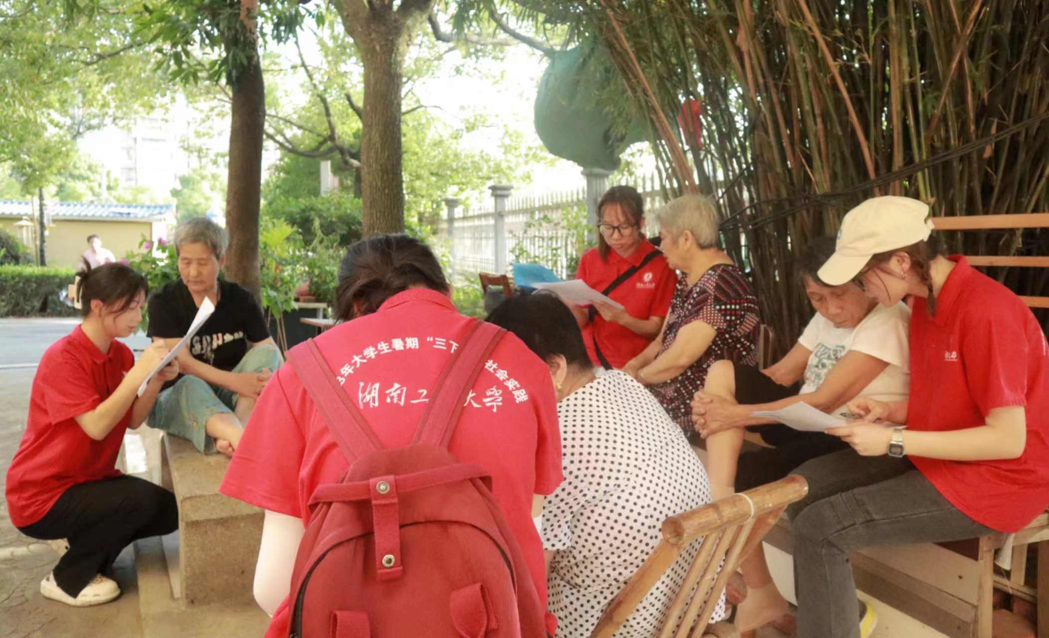 在黨的引領(lǐng)下深入社會(huì)實(shí)地調(diào)研的身影,是最紅最亮眼的那一抹色彩。黨建逐夢(mèng)小分隊(duì)為更全面了解長(zhǎng)華社區(qū)基本情況,大家分頭行動(dòng)向社區(qū)居民發(fā)放調(diào)研問(wèn)卷,收集居民對(duì)社區(qū)治理效能提升的建議。在調(diào)研過(guò)程中,隊(duì)員認(rèn)真負(fù)責(zé)發(fā)放問(wèn)卷,與乘涼老奶奶一同圍坐并耐心向其解釋問(wèn)卷、扇風(fēng)驅(qū)蚊,展現(xiàn)出了湖工商大學(xué)生優(yōu)秀素養(yǎng)。