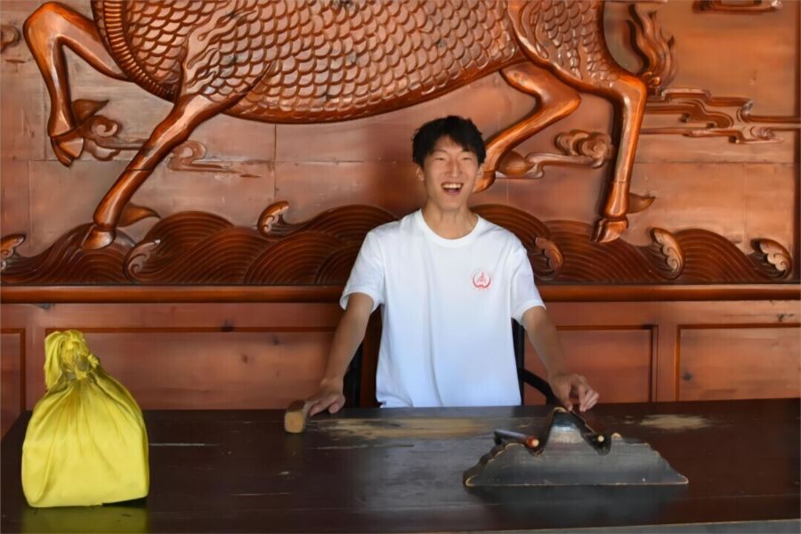 圖為非遺傳承人董思明為實踐隊簽字致辭