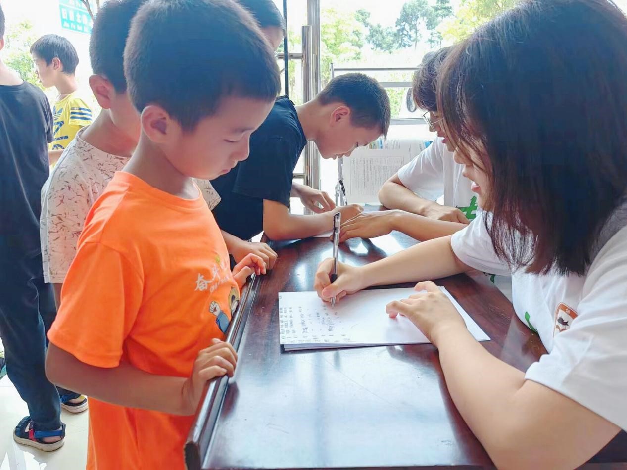 招生圓滿成功,盛放“青藤”花。8月8日下午,青藤支教隊二隊在鎮(zhèn)雄縣魯家院子新苑社區(qū)招生活動順利舉行。在支教隊和社區(qū)工作人員前期宣傳的作用下,陸續(xù)有家長帶著學(xué)生來報名,從幼兒園到初中,各種年齡段的同學(xué)都很樂意參與支教活動。支教隊員對學(xué)生的年齡,年級,家長信息等進行了登記,并告知了注意事項以及上課所需物品。截止到下午5點,魯家院子支教點已經(jīng)有八十多個學(xué)生前來報名,招生工作圓滿結(jié)束。