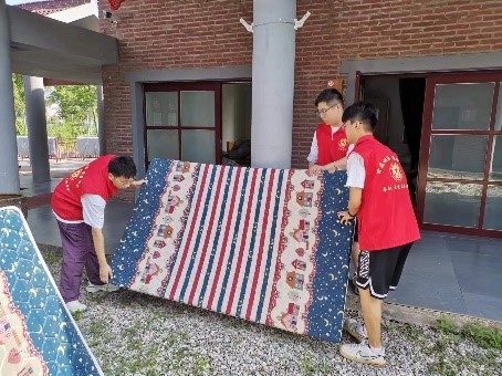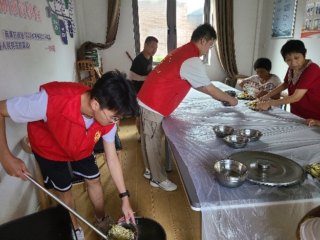 在上午的活動中,實踐團成員們分工合作,有序地進行著“溫馨苑”殘疾人之家的內務整理。他們用心清掃、整理每一個角落,為殘疾人打造一個整潔、舒適的居住環境。隨后,他們精心擦拭運動器材,確保殘疾人在鍛煉時有一個干凈、衛生的空間。在輔助就餐環節,實踐團成員們細心地幫助殘疾人準備食物、搭起餐盤,為他們創造了更方便、愉悅的用餐體驗。通過這個簡單的舉動,實踐團成員們用心讓每一個殘疾人感受到尊重與關愛。