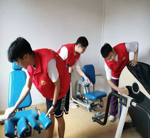 實踐團(tuán)成員正在清潔運動器材