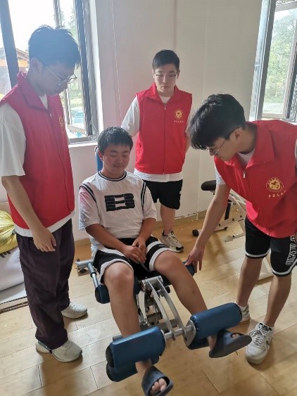 實踐團(tuán)成員正在幫助殘疾人進(jìn)行康復(fù)訓(xùn)練