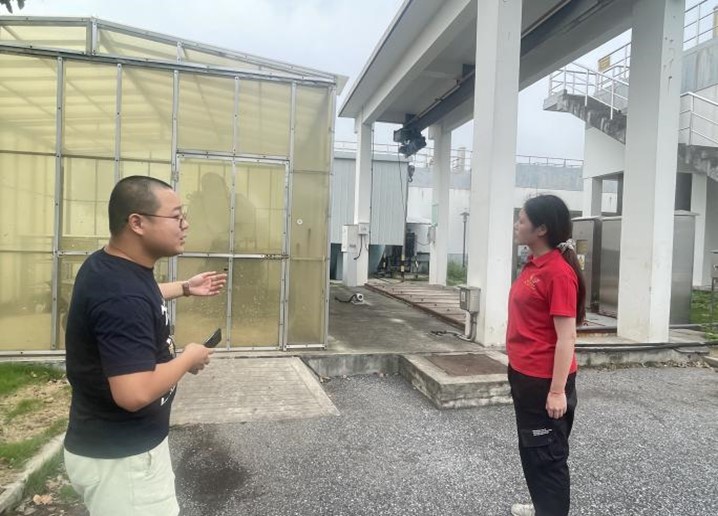 圖三 污水處理廠負責人(左一)在向團隊成員展示抽調的凈水質量