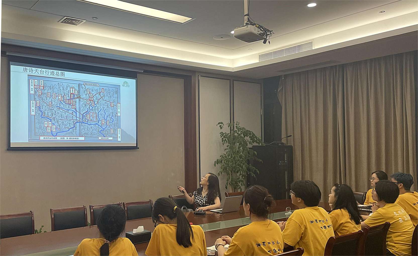 天臺(tái)縣是“浙東唐詩之路”的目的地,石梁風(fēng)景區(qū)更是“浙東唐詩之路”的精華所在。7月15日,臺(tái)州天臺(tái)山文化研究會(huì)儒學(xué)部副主任張朝紅受邀參加座談會(huì),以“云端詩庫與詩路經(jīng)濟(jì)帶開發(fā)”為主題為團(tuán)隊(duì)教授有關(guān)“浙東唐詩之路”相關(guān)知識(shí)。