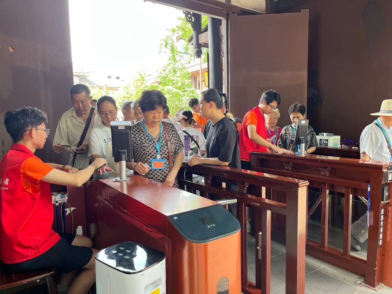 與往常不同,近期到訪的游客還包括眾多前來參觀學習的黨員,因此三蘇祠博物館從早上9點開門時便客流滿滿。盛夏的三蘇祠生機勃勃,古樹蔥蘢,但也同樣酷熱難耐。驕陽似火,風過臉頰感覺到的卻是一陣熱浪。負責檢票的隊員就是在這樣的條件下,連續站立8個小時,完成一天3500余人次的檢票任務。他們不僅要確保一人一票,憑證入館,還要維持快速且穩定的入場秩序。實踐隊員看見個別乘坐輪椅的老人,行動十分不方便,便主動打開閘機旁的側門幫助其入場。有游客對入館規則和購票明細不太了解,實踐隊員耐心為其提供咨詢解答,幫助游客解決相關疑惑,提高出行品質。“雖然檢票工作非常辛苦,但我很樂意在這次意義豐富的志愿活動中不斷突破自我”,隊員唐鵬城在結束一天繁重的任務后依舊熱情滿滿。