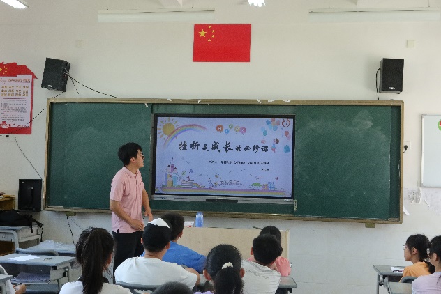 以智慧心。實踐隊隊員何云凱主講了“直面挫折,化繭成蝶”為主題的心理微課堂。何云凱通過熱身小游戲、畫人生線段圖等形式,精心設計互動環節使小學生身臨其境,課堂氛圍活躍。他以案例分析、微視頻等方式帶領兒童科學認識壓力與挫折,探尋正確應對挫折的方法。課堂內容讓兒童們受益匪淺。最后,他寄語兒童:“勇士是在充滿荊棘的道路上前行的。”