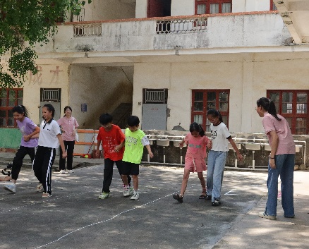 以體強心。實踐隊隊員張子琪和張杏杏分別主持“同心協行”、“松鼠鉆樹洞”心理素質拓展活動。兒童們在賽道上以兩人三足的方式相互協助、齊頭并進,為了共同的勝利同足前行。在松鼠搶樹洞游戲中,兒童們展現出充沛的精力,默契配合,認真完成活動任務。現場加油聲此起彼伏,兒童們洋溢著快樂的笑容。