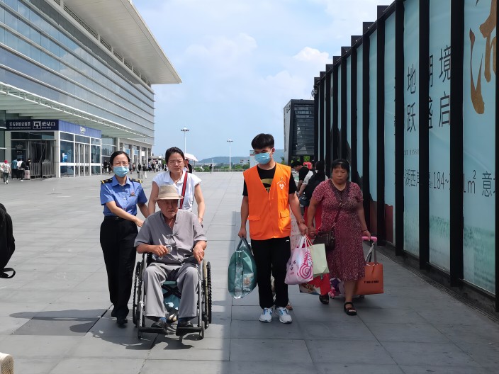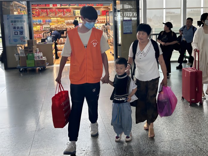 秘籍二:周到的服務是拉近志愿者與旅客的秘寶。“小朋友,注意和家人一起走,牽著爸爸媽媽的手,別和父母離得太遠。” “奶奶,我來幫您拎著吧,G1203車次要從這里上二樓候車廳。” “阿姨,無障礙電梯在這邊,您行李多,我可以幫忙推嬰兒車過去嗎?”…… 幫助了這些旅客后,志愿者秦家怡回望進站口,等待著下一位需要幫助的旅客。直到送走最后一名旅客后,走在夕陽下,散射陽光的是她那被汗水打濕的頭發。在值班室里她那滿滿的一瓶水,只有在快回家時才會被一飲而盡。秦家怡也是小朋友的“知心姐姐”,遇到緊張不敢說話的小朋友,她總能完美溝通。記得那次,唯獨她注意到小孩鞋子的歪松,便俯下身子為他穿好。這樣的細微之舉,便是她周到服務的體現,每幫助一位旅客,秦家怡的心中便多了一份滿足。