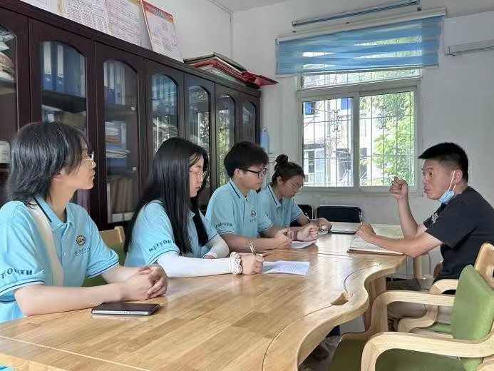 首先,隊員們對社區工作人員進行社區治理相關內容的采訪,探詢社區基本情況和特色服務。通過與社區書記的談話,隊員們了解到該社區在黨建方面積極響應國家號召,深入貫徹落實習總書記考察湖北武漢重要講話精神,堅持黨建引領,堅持群眾決策共謀﹑發展共享﹑建設共管﹑效果共評﹑成果共享,共同建設美好家園。古田社區的組織架構主要分為5個層級,同時還設有網格黨支部,促進社區黨建工作順利開展。