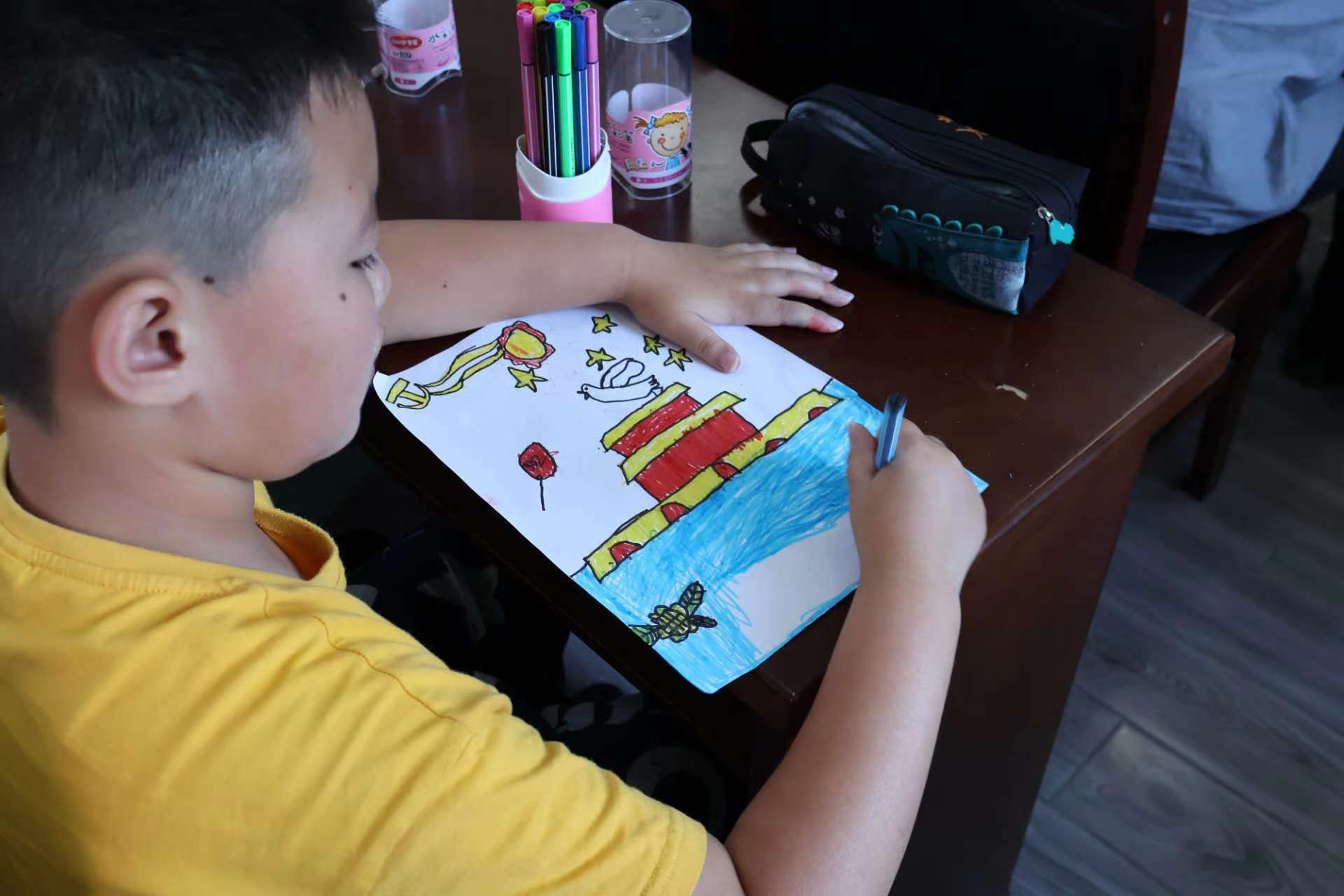 一盒彩筆,一張A4紙,也許就是一個(gè)絢麗的世界。課堂上,小朋友們拿起手中的畫筆,用稚嫩的小手勾勒著心中的小小世界,一筆一畫的寫下漢字與拼音注釋。