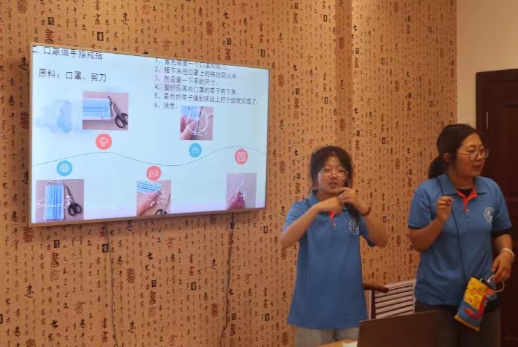 活動伊始,團隊成員劉玉卿、劉曉君以PPT演示的形式向小朋友們展示第一個手工作品——口罩戒指,并現場向小朋友們演示這項手工創作步驟。