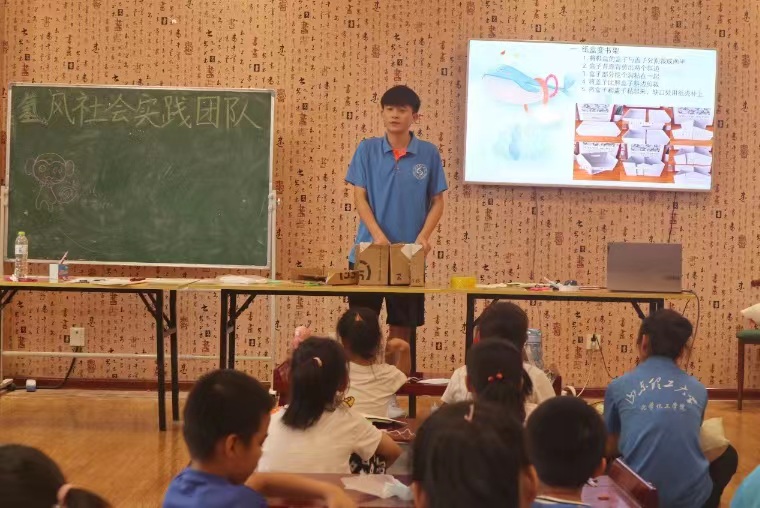 接著,實踐團成員谷偉豪向小朋友們展示第二個手工作品紙箱書架,并介紹了制作步驟和用途。他通過現場手工操作向小朋友們展示了如何將廢舊紙箱轉化為有用的物品,并鼓勵小朋友用創意想法來改造自己周邊的廢舊物品。