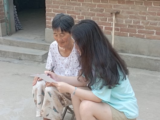 圖為實(shí)踐隊(duì)員走訪農(nóng)戶進(jìn)行問卷調(diào)查。