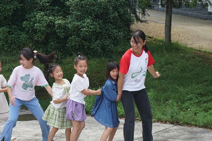 圖為體育課上支教組志愿者與小朋友們一起游戲 安敏攝