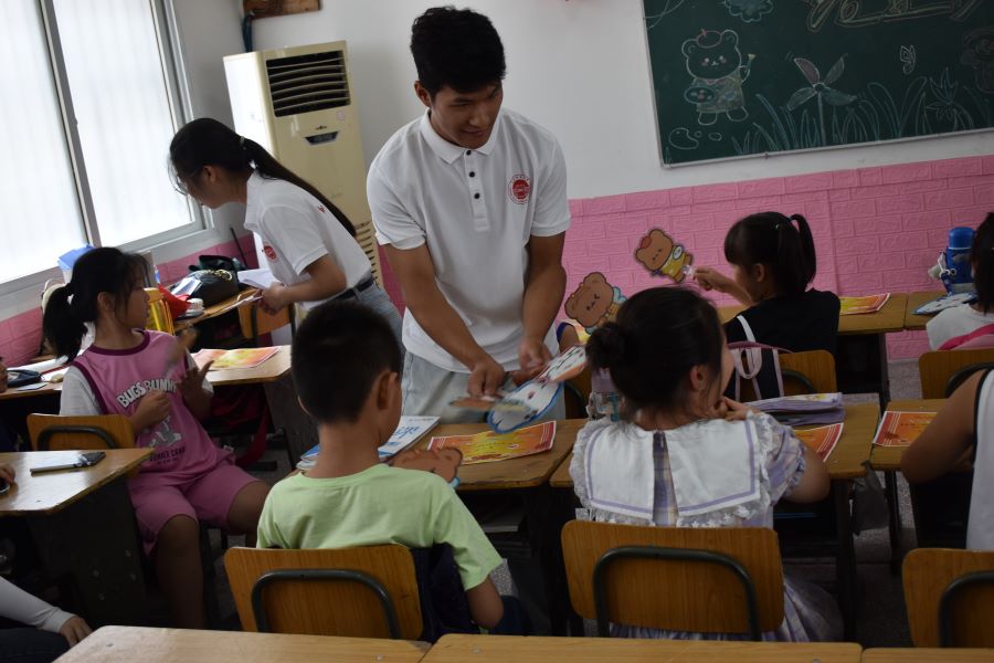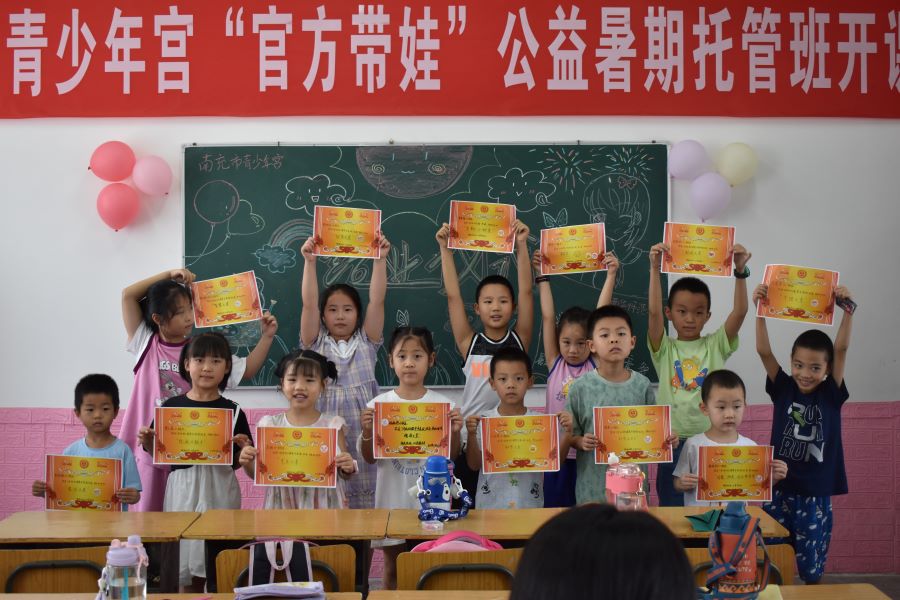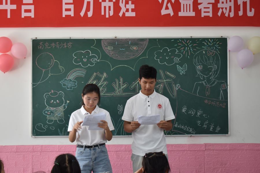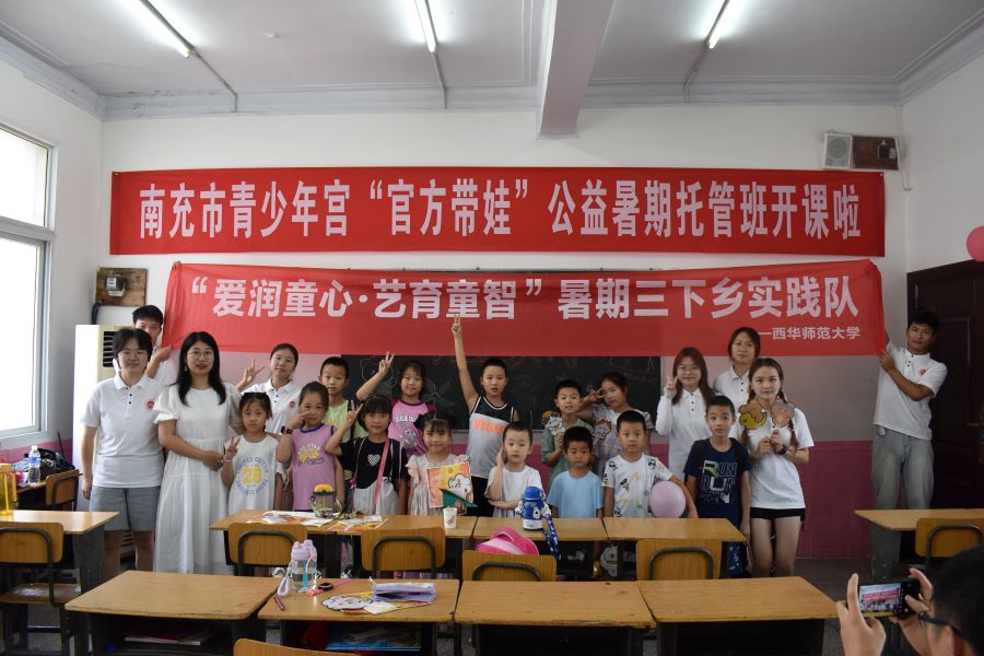 2023年7月22日,西華師范大學“愛潤童心·藝育童智”暑期社會實踐團隊在南充市青少年宮展開十天暑期公益課堂結業儀式,儀式上,指導老師和隊員們分別發言,并為孩子們頒發獎品,小朋友們表演才藝,最后在橫幅上簽名,此次暑期公益課堂正式結束。