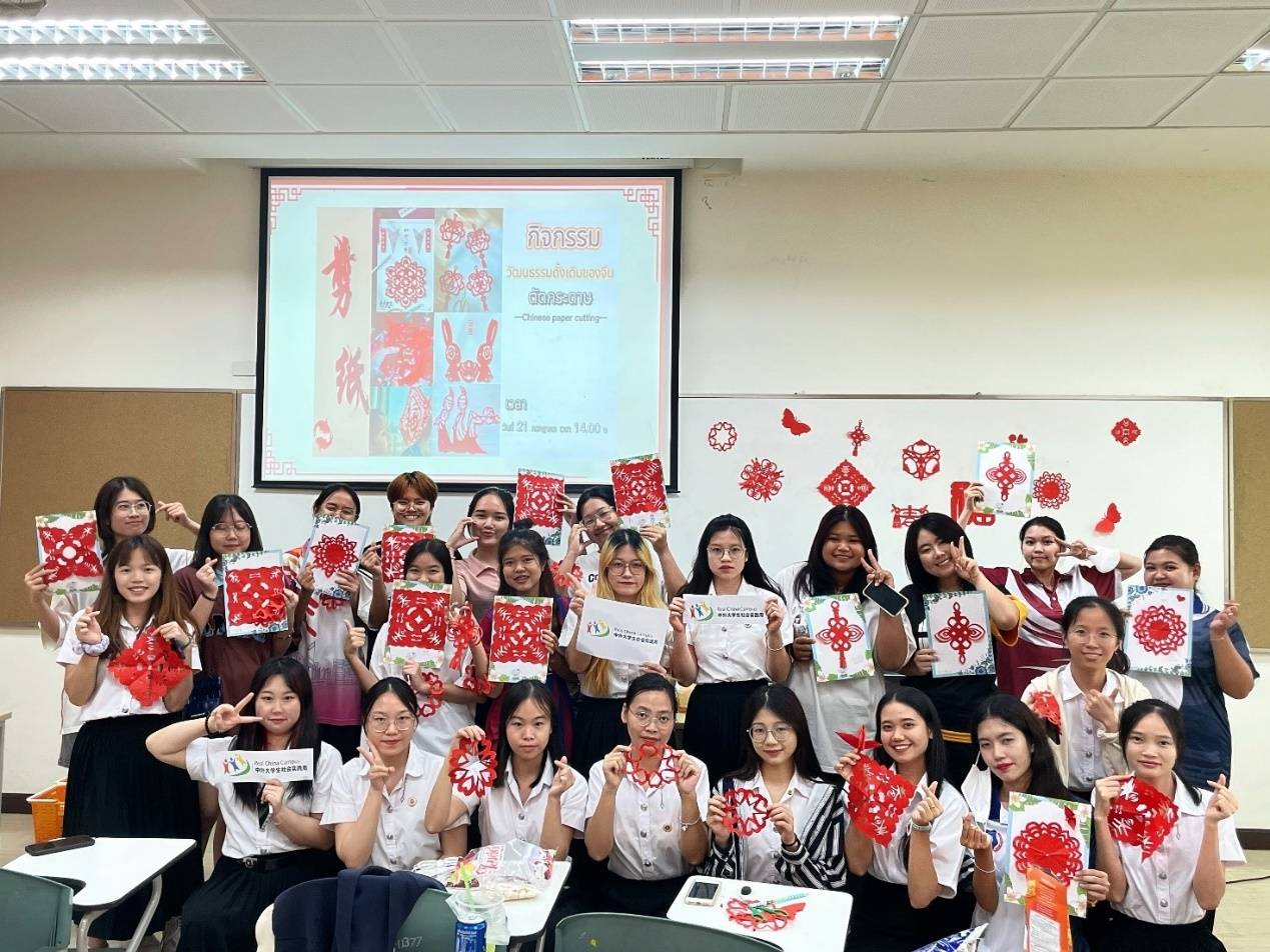 7月21日在泰國曼谷北部大學,實踐團開展中華才藝剪紙教學活動,積極弘揚中國優秀傳統文化。來自中國的實踐團成員首先向泰國學生講解了中國傳統剪紙的歷史、樣式,向泰國學生演示了剪裁花朵、中國結、窗花等方法,并細心教授留學生折疊、裁剪技巧,大家一邊討論,一邊動手實踐。剪刀在手間跳躍,紙屑在空中紛飛。在談笑間,一幅幅精美的剪紙圖案便呈現在大家手上,泰國學生們看著自己完成的剪紙作品露出了開心的笑容。活動現場洋溢著輕松歡樂的氣氛。生動有趣的剪紙活動與泰國學生零距離的互動,讓泰國學生在邊學邊玩中真切體驗到非遺的文化魅力。