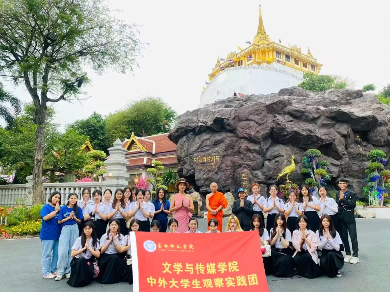 感受異域文化,增進文明互鑒實踐團成員來到了泰國曼谷北部大學參加拜師節,感受泰國的尊師文化。來到泰國金山寺、臥佛寺,感受異域文化氛圍。“文明因交流而多彩,文明因互鑒而豐富”。實踐團成員在駐足中觀賞每一件展品,領略“一國一物一風情”,在實踐中了解豐富多彩的他國文化,在交流探討中領悟文明變遷,感受世界文明交融互鑒的有益成果。