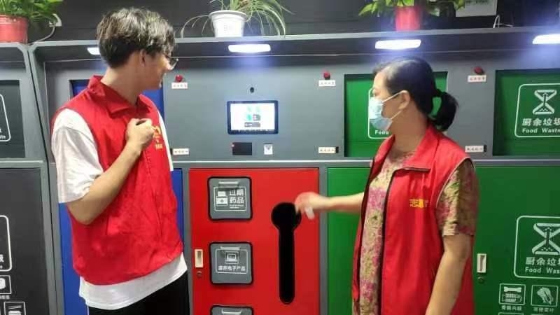 圖為環(huán)保站阿姨在教小隊(duì)成員如何使用分類(lèi)設(shè)施。南京工程學(xué)院 劉其春 供圖