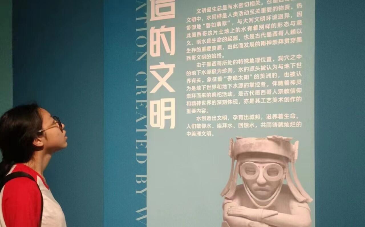 在墨西哥古代文明展上,團(tuán)隊成員們欣賞到了各種樣式奇異的石像石雕。這些穿越千年歲月的石像石雕風(fēng)格奇特,展示了古墨西哥人先進(jìn)的雕刻技術(shù)與文化生活,證明了古代中美洲雕刻文明的先進(jìn)繁榮,體現(xiàn)了千年歷史的神秘與未知。石像是古文明傳承至今重要的載體,而如今科技同樣成為了文明傳播和保存的重要載體。此次展出中提供的虛擬場景技術(shù),參觀者可以帶上VR眼鏡根據(jù)游覽者位置實時收聽線上解說。展廳內(nèi)還有大幕視頻,人們甚至可以用手機(jī)進(jìn)行投票答題互動,進(jìn)一步加深了對古墨西哥文明的了解與參觀印象。