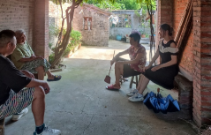圖為小隊成員與果園內(nèi)工作的果農(nóng)進行交談。
