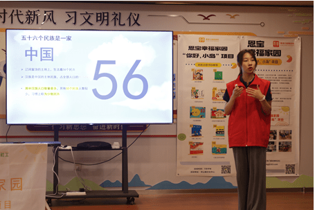 圖為團(tuán)隊(duì)成員額爾赫斯同學(xué)為小朋友們講解有關(guān)蒙古族的民族課程