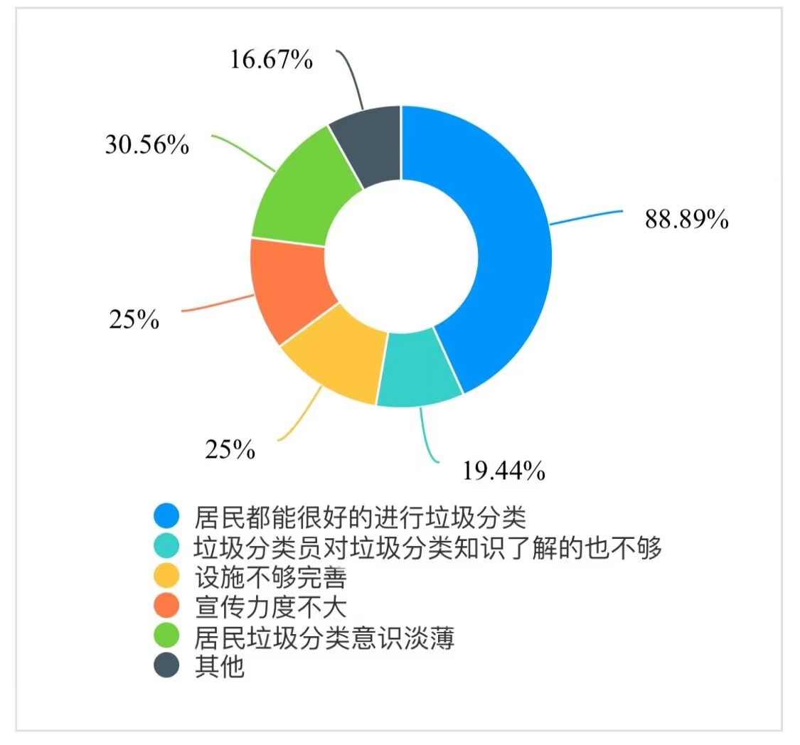 根據調查結果顯示,有近一半的居民有垃圾分類的習慣,且在日常生活中能夠做到正確進行垃圾分類。對于那些不曾進行垃圾分類的居民來說,意識淡薄這個主觀因素占比高達30.56%,設施不夠完善與宣傳力度不大這兩個外部因素占比均為25%和25%。除此之外,還有一個容易被忽視的因素,即垃圾分類員對垃圾分類知識掌握不牢,占比19.44%。基于上述數據,社區、鄉鎮應在基礎設施與宣傳方式兩個方面做出有效改變,實踐團隊成員與社會垃圾分類工作者也要強化垃圾分類知識,成為合格的垃圾分類知識的傳授者。
