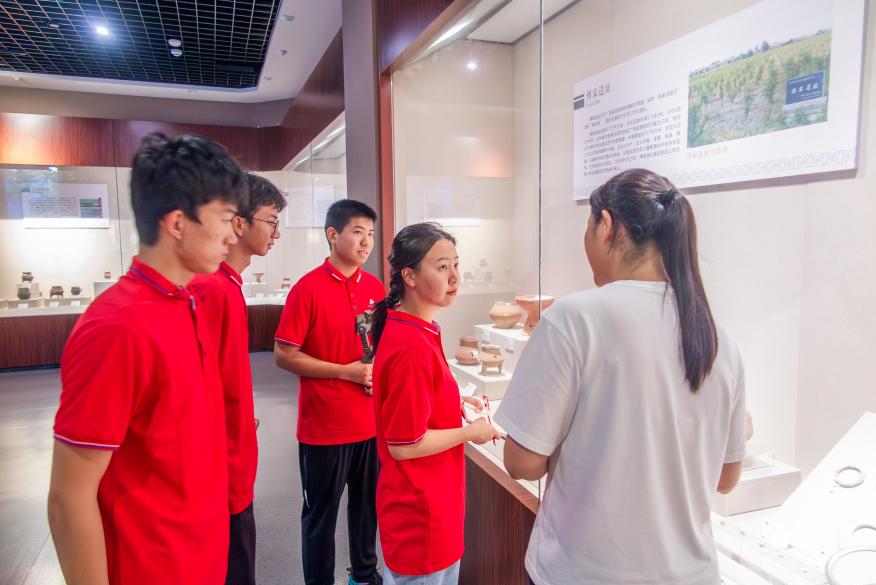 東營鐘靈毓秀、人杰地靈,東營市歷史博物館記錄著這片土地的發展。東營歷史博物館講解員帶領實踐隊員首先參觀原始文明發展歷程及展廳所展出的部分文物,如陶藝品、石器、遺跡發掘現場、青銅器、雕塑等。這些文物不僅展示了當時人民的智慧和技藝,還反映出其社會生活的方方面面。