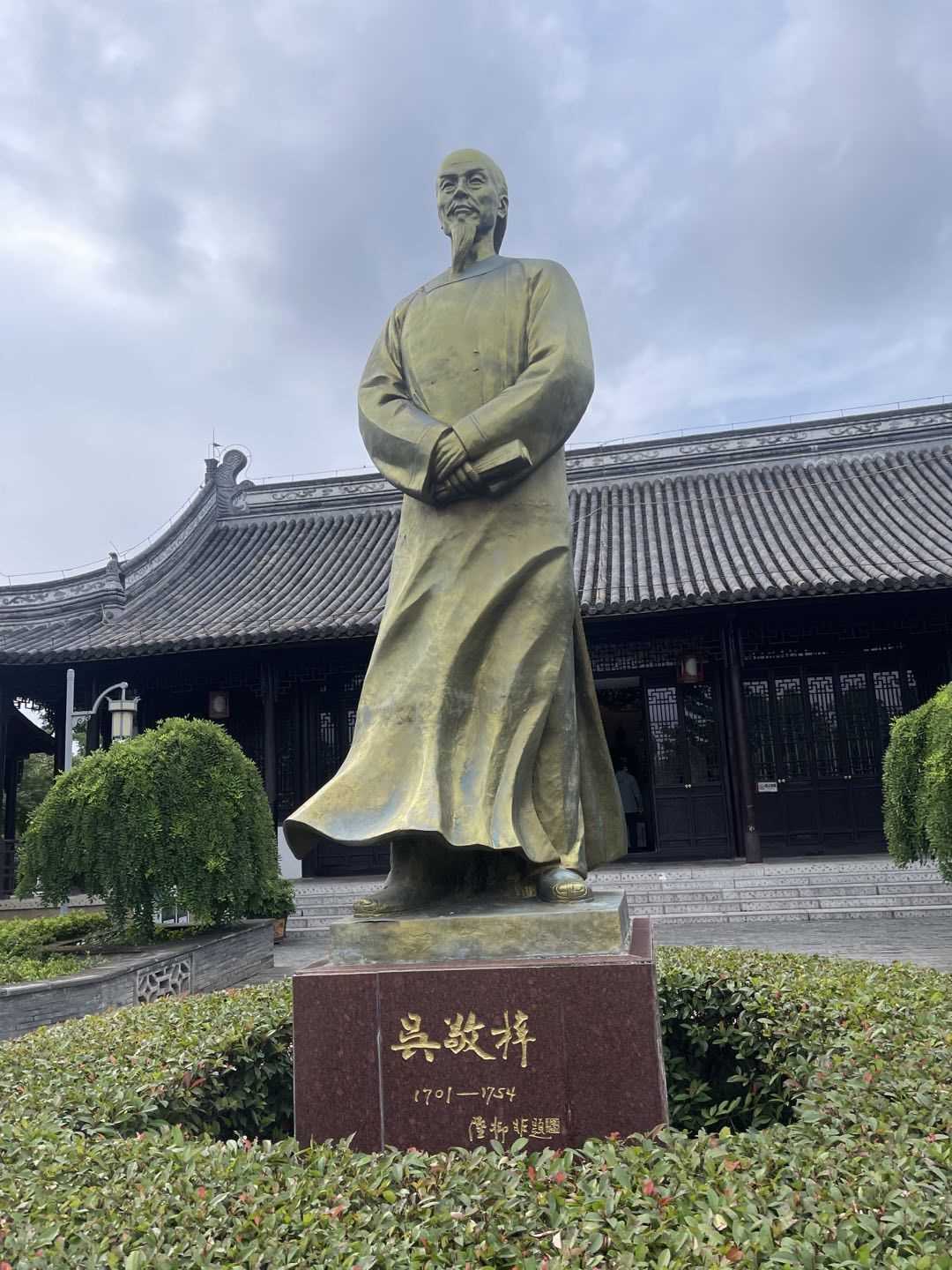 隨著腳步的前進,小隊成員到達了吳敬梓紀念館,正廳前的草坪中央,佇立著吳敬梓著長衫立銅像一尊,高約十多米,長須,莊嚴。參照吳敬梓裔孫吳熾棨形象創作而成。若無所思而有所思。小隊成員想象中的吳敬梓,總免不了從《儒林外史》中的幾個人物來揣度,但這里的他,不是陶淵明“采菊東籬下,悠然見南山。”的沖淡恬遠,也不是李白的“君不見黃河之水天上來,奔流到海不復回。”的瀟灑倜儻。他年近“天命”,歷經冷暖沉浮而塊壘難消;他“暖足”歸來,正稍加喘息而又將四處奔波;他看世態太深,深邃的眼眸中透露著他的沉重和悲哀。
