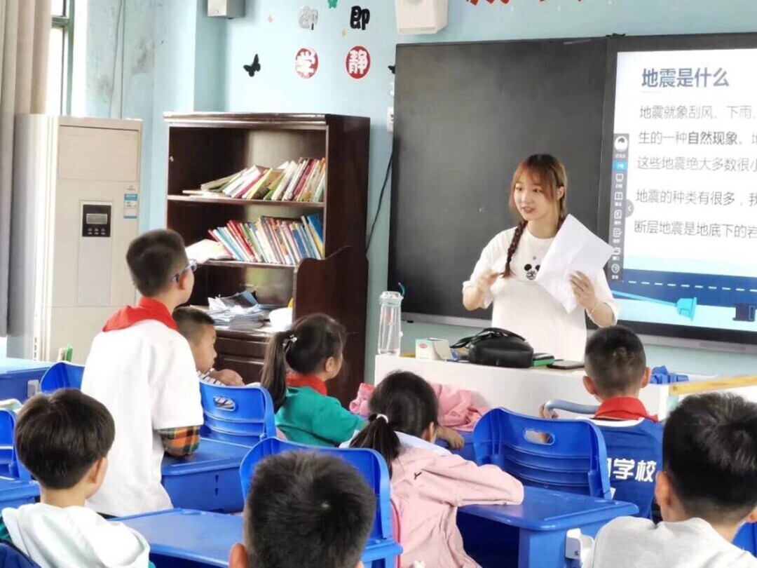 圖為實踐隊員向小朋友們介紹地震相關知識。 李靜媛 攝