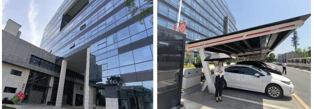 在環(huán)境優(yōu)美的園區(qū)內(nèi),看似不起眼的大樓外墻也充滿玄機。隆基園區(qū)內(nèi)各類建筑的幕墻都鋪設(shè)了太陽能發(fā)電設(shè)備,這種能夠?qū)⑻柟廪D(zhuǎn)化為電能的建筑材料可以用于建筑物的各個部位,實現(xiàn)電力的自發(fā)自用或并網(wǎng)發(fā)電。園區(qū)內(nèi)還設(shè)置了多個光儲充一體綠電車位,不僅實現(xiàn)了清潔能源生產(chǎn)、應(yīng)用與儲存的連接,更傳遞了綠色低碳的生活理念。