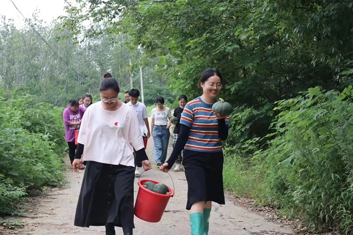 一方面堅持持續推進人居環境的整治提升,另一方面村委會開始進行特色產業振興。對于土地資源的利用,山戴村堅持規劃先行,統籌推進。在發展村集體經濟中與企業合作,在村集體承包的土地中種植特色農產品——山芋、紫薯、南瓜等,村干部帶頭,積極引導村民參與,有效促進村集體經濟發展、企業盈利、村民增收,實現了利益最大化。在村干部的帶領下,團隊成員參與到摘南瓜的行列中,體驗到豐收的快樂。行之力則知愈進,知之深則行愈達。調研團成員感慨道:“人民群眾的獲得感、幸福感、安全感更高更足更持續,正是人居環境整治提升取得重大成效的體現啊。”