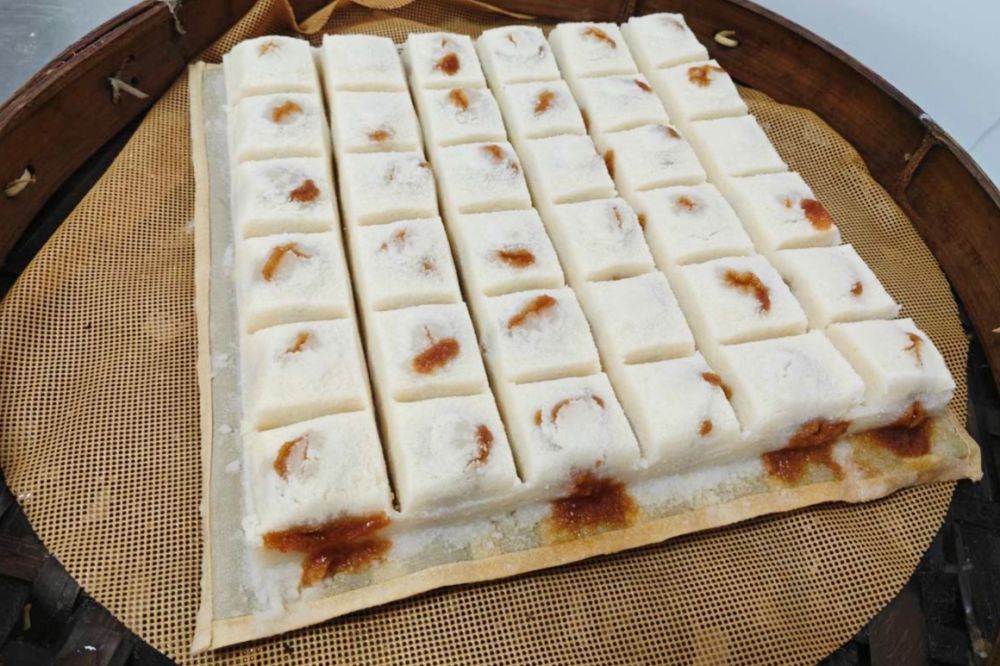 確定完方案之后,小組成員便開始實踐,于莫干山校區食品樓進行茶糕的實踐改良工作。第一次實驗時,成員們將95g糯米粉和36g粳米粉混合在一起,加水混合,讓面粉處于抓起來成團,一捏就散的狀態,繼而將粉過篩,均勻地鋪滿模具,并加入不同內陷,再篩一層于其上,用刮板略微鋪平壓實。上鍋蒸煮40分鐘后,呈現效果不佳,表面仍有生粉,且表皮開裂,內陷外露。經過成員們的嘗試,內陷味道尚可,表皮可算軟糯,但仍有部分表現出“沒有熟”的狀態,且寡淡無味。反思之后,成員們總結失敗的原因,將原因歸結為幾個要點:一是糯米粉和粳米粉的比例不妥 ,應更為嚴格地按照古法記載的7:3可能會呈現更好的效果;二是未把兩種粉充分混勻后加水,導致蒸制所得的糕點成分不勻,多有生澀;三表表皮索然無味,考慮后續改進中將糖水倒入粉中抓勻;四是內陷體積過大不夠平展導致表皮開裂,后期將降低內陷高度;五是蒸制后仍存在生粉,可能原因為實驗室提供的鍋略小,供給給糕點蒸制的蒸汽不足,而改良使用的模具過大,故不容易熟制。