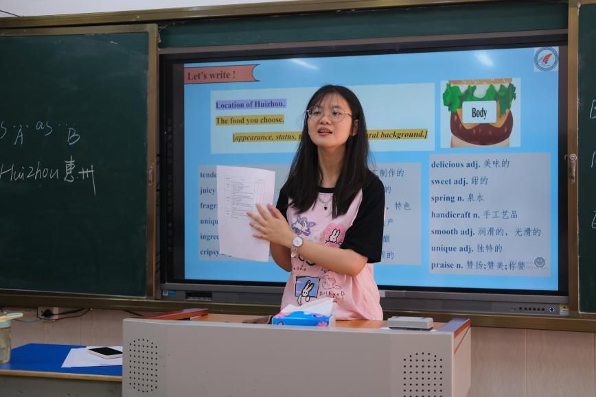 結(jié)合惠州民俗,開設(shè)雙語課程為講好鄉(xiāng)村故事,弘揚(yáng)鄉(xiāng)村文化,促進(jìn)中學(xué)生德、智、體、美、勞全面發(fā)展,楊僑隊打磨多元化的優(yōu)質(zhì)課程,志在提高學(xué)生多維度的素質(zhì)。以英語專業(yè)知識為本,楊僑隊從英語詞匯、口語和寫作課程出發(fā),夯實學(xué)生的外語學(xué)習(xí)水平基礎(chǔ)。課程注意與惠州民俗文化特色融合,如:詞匯課以惠州當(dāng)?shù)孛袼谆顒訛橹黝},介紹了與民俗文化相關(guān)的詞匯與表達(dá),向?qū)W生進(jìn)行了知識的輸入;讀寫課以“食在惠州”為主題,向?qū)W生介紹當(dāng)?shù)孛朗车挠⒄Z表達(dá),同時創(chuàng)設(shè)英語情境,讓學(xué)生在教師對話引導(dǎo)下自主完成一篇介紹惠州特色美食及其制作方法的作文;口語課則是通過繞口令挑戰(zhàn)賽等形式鼓勵學(xué)生大膽開口說英語,并靈活運(yùn)用之前所學(xué)的表達(dá),達(dá)到知識轉(zhuǎn)化輸出和鞏固的效果。這些特色課程充分浸潤當(dāng)?shù)匚幕鰪?qiáng)學(xué)生對家鄉(xiāng)的文化自信,推動了優(yōu)秀傳統(tǒng)文化的繼承與發(fā)展。