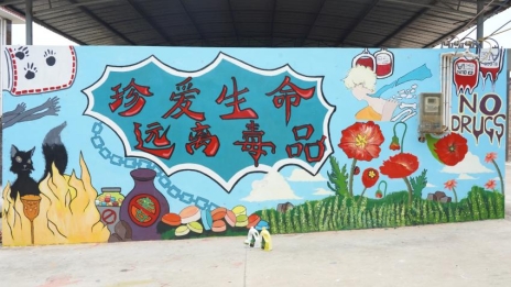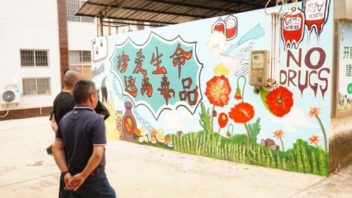 一幅色彩艷麗的彩繪躍然于舊白墻上,讓本不起眼的墻壁“搖身一變”,成為一道特殊的“禁毒教育”風景線。比起單一的標語、生硬的宣傳欄,禁毒宣傳墻繪結合了卡通人物形象,使枯燥的禁毒知識有了畫面感,大人小孩也更容易接受。