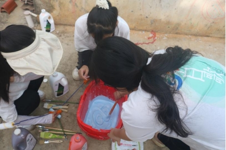 繪制過程中,實踐隊員們不僅要經歷長時間的繪畫工作,還要承受炎炎烈日的天氣環境。即便穿上了防曬“硬核”裝備,在經歷長時間的暴曬后,隊員們也從“白哲”變得“黝黑”。但即便如此,實踐隊員們也不曾退縮,在持續高溫的環境下,他們頂著烈日繼續作畫。在臺風天氣過后,又拿起畫筆,不停歇的開展墻繪工作。汗水順著臉頰滴入調色盤,他們不停地揮動著畫筆,將一天的辛勤勞作融入繪畫中。