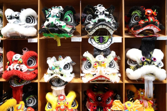 第三步是“寫”,即上色,用顏料把獅子的頭、眼、鼻等畫出來,并在上面繪制各種圖案。隨后,李祖杰帶著實踐隊員們來到醒獅作品展廳,一進門,隊員們就被展廳內擺放著各種色彩鮮艷的獅子頭吸引了目光,“太驚艷了!這是我見過舞獅種類最多的一次!”隊員們驚嘆道。李祖杰介紹到,“舞獅分為南獅和北獅,南獅主要分為佛裝獅和鶴裝獅。我們主要生產南獅,在南獅中,佛裝獅和鶴裝獅最大的區別就是嘴巴的形狀,佛裝獅的嘴巴有向上的凸起,鶴裝獅的嘴巴則偏扁圓。”