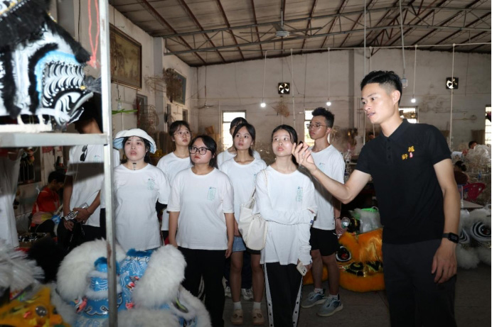 隨后,實踐隊員們來到遂溪龍灣村,對國家級非遺遂溪醒獅傳承人李祖杰進行采訪。李祖杰對實踐隊員們的到來表示熱烈歡迎。據了解,湛江遂溪被譽為中國醒獅之鄉,其醒獅的制作工藝尤為獨特,醒獅傳承人李祖杰帶領實踐隊員們來到醒獅制作工廠,了解醒獅的制作工藝。李祖杰為實踐隊員們介紹到,制作獅頭的彩扎共有四大步驟,分別是扎、撲、寫、裝。首先是“扎”的工藝,將竹筏扎成一個獅子頭輪廓,雖然也有藤條等其他代替材料,但是由于竹子其原料普遍等特點,獅子頭的制作更多的是使用竹筏。第二步是“撲”,在獅子頭的制作完成后,工人們會用米糊作黏著劑,先撲蚊帳布再撲紙,米糊是由米粉和糯米粉混合而成,屬于環保材料,沒有任何的化學添加劑。